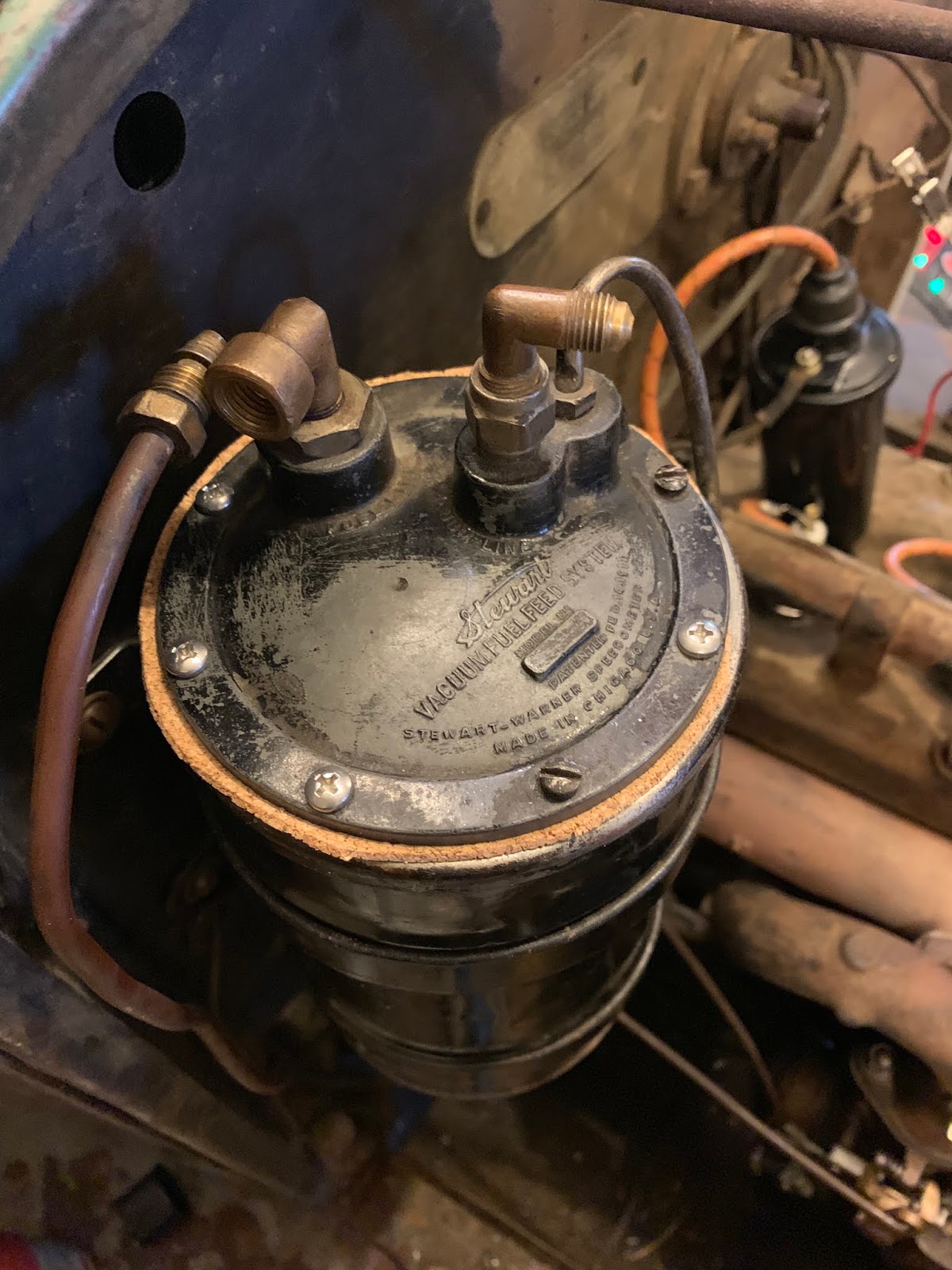 I found all the parts to the vacuum tank fuel pump in the trunk, but can't make it work. (that is the round thing on the firewall at the upper right in the picture above).